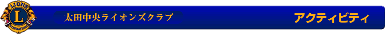 ・2003年 例会風景 ・2003年8月10日(日)高寺川弁天沼清掃 ・2003年10月8日 ライオンズデー ・2004年6月6日 弁天池除草作業 ・2004年6月11日 ライオンズクラブ主催 薬物乱用防止事業 ・2004年12月20日 忘年例会風景 ・2005年2月8日 サンリバー老人施設慰問 ・2005年10月5日 第5回 老人介護施設慰問 <八休苑> ・2005年12月20日 第891回 ネス同伴忘年例会 ・2006年5月23日 出張例会 磯部温泉 ・2006年8月25日 第一例会(納涼例会)サッポロビール工場内 ・2006年8月26日 太田市老人施設慰問 ・2006年9月3日 高山神社清掃 ・2007年2月23日 老人施設コスモス慰問 ・2007年4月14日 第2回北部運動公園芝桜植栽 ・2007年6月30日 第38回太田市少年野球大会 太田中央LC杯決勝戦 ・2008年9月7日 高山神社清掃 ・2009年4月3日 花見夜間例会 ・2009年6月10日〜11日 出張例会 四万温泉 ・2009年11月11日 老健施設(高砂荘)慰問 ・2010年6月8日 出張例会 八ッ場ダム(高田館泊) ・2010年11月14日 第2回ハッピーミート(婚活)、第2副会および足利西LC出席 ・2000年12月29日〜2010年6月5日 YE生 受け入れのあゆみ ・2011年9月4日 高山神社清掃 ・2011年10月8日 ライオンズの森清掃 ・2011年11月3日 太田中央L.C 萩の会合同吟行 ・2011年12月18日 ハッピーミート(婚活)足利西L.C見学参加 ・2012年9月17日 第一回太田中央ライオンズクラブ 小学生俳句コンクール ・2012年12月 ハッピーミート2012 ・2013年9月1日 高山神社清掃 ・2013年9月 太田中央ライオンズクラブ創立45周年記念事業 太田市小学生俳句コンクール ・2014年10月12日 第3回太田中央ライオンズクラブ 小学生俳句コンクール ・2015年2月7日 こころの歌と二胡の調べ ・2015年2月8日 薬物乱用防止講演会 ・2015年2月22日 ハッピーミート(婚活) ・2016年6月24日 第99回福岡国際大会 福岡市冷泉公園